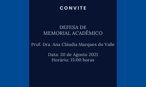 DEFESA DE MEMORIAL ACADÊMICO Prof. Dra. Ana Cláudia Marques do Valle Data: 20 de Agosto 2021 Horário: 15:00 horas Link: meet.google.com/rjc-kiik-geh Categorias: Notícias Listar Todas Voltar