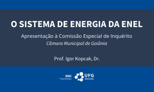 A fim de subsidiar os trabalhos da Comissão Especial de Inquérito-CEI da Enel, o Vereador Mauro Rubem, em contato com a Associação de Egressos e Egressas da UFG, acolheu a sugestão e convidou o Professor do curso de Engenharia Elétrica da UFG, Igor Kopcak, que expôs aos Vereadores esta brilhante aula que poderá esclarecer à população e melhor entender o Sistema de Energia Elétrica do Estado de Goiás, sobre o enquadramento tarifário e a composição da tarifa de energia elétrica.